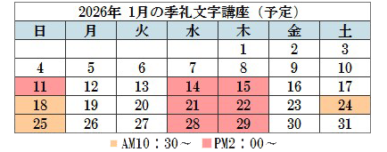2026年1月の季礼文字講座スケジュールは以下の通りです。